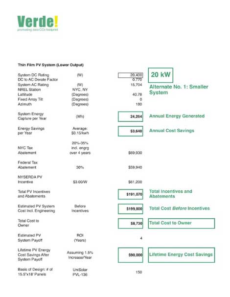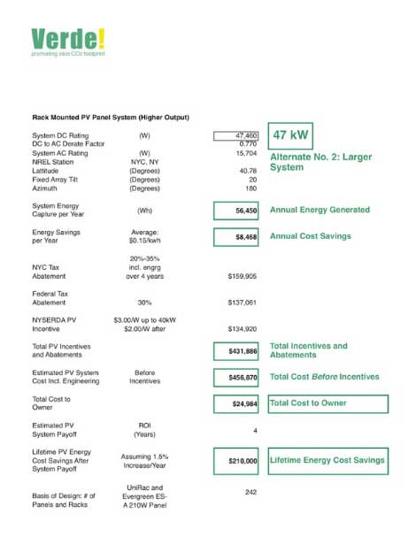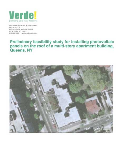 This is a feasibility study for the installation of two alternate photovoltaic panel systems – PV – on the roof of a multi-story residential building in Queens, NY. Based on current federal and state tax abatements and NYSERDA credits, the net cost of the smaller of the two systems would be $8,730 and would generate $90,000 of electricity over its lifetime, and the net cost of the larger system would be $25,000 and would generate $210,000 of electricity over its lifetime.
